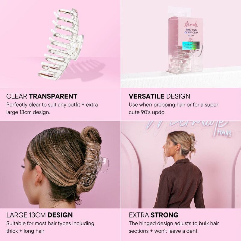 Bringing back the 90s with the Mermade Claw Clip in clear. The barrel claw hold is made with 100% plastic and designed with smooth edges so it won't rip or damage hair. It's fairly large in size, so you can clip up a long pony or a thick mane. Get ready in style as you prep your hair, or wear it out on the town for a casual-cool statement.