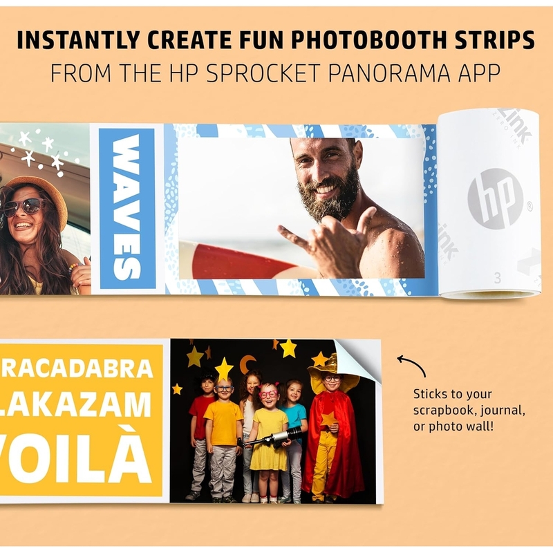 Personalize your photo and label creations in a fun and exciting new way with the HP Sprocket Panorama Photo and Label Printer. This one-of-a-kind printer lets you instantly print your favorite photo projects, labels, photobooth strips, and more, from 0.5” to 9” long on 2” wide sticky-backed paper!