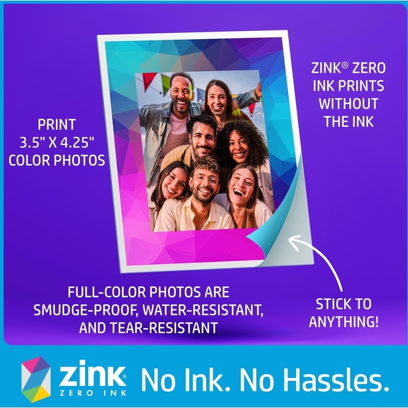 - No Ink. Print photos on Zink paper, which resists water, smudges, and tears, and stick them anywhere.