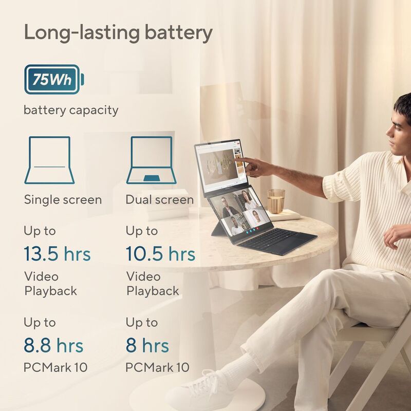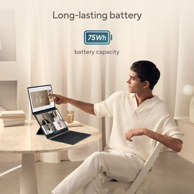 The ASUS Zenbook DUO touchscreen laptop delivers powerful performance and AI-ready features on Windows 11. The ultra-fast Intel® Core™ Ultra 9-155H processor, paired with Intel® Arc™ graphics, enhances tasks with AI capabilities. With 2TB SSD storage and 32GB LPDDR5x RAM, you can explore more seamlessly.