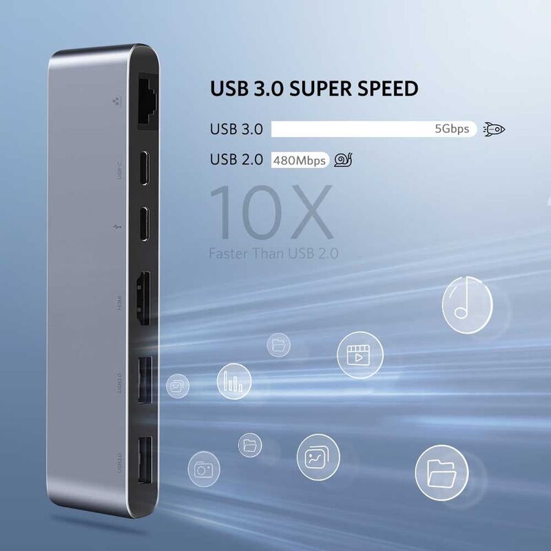 The Hub has 2 USB 3.0 ports and supports data transfer speeds of up to 5 Gbps. It downloads or uploads files in seconds. You can extend your laptop to 3 USB 3.0 ports for external hard drive, USB flash, mouse, keyboard. - ETHERNET GIGABIT
