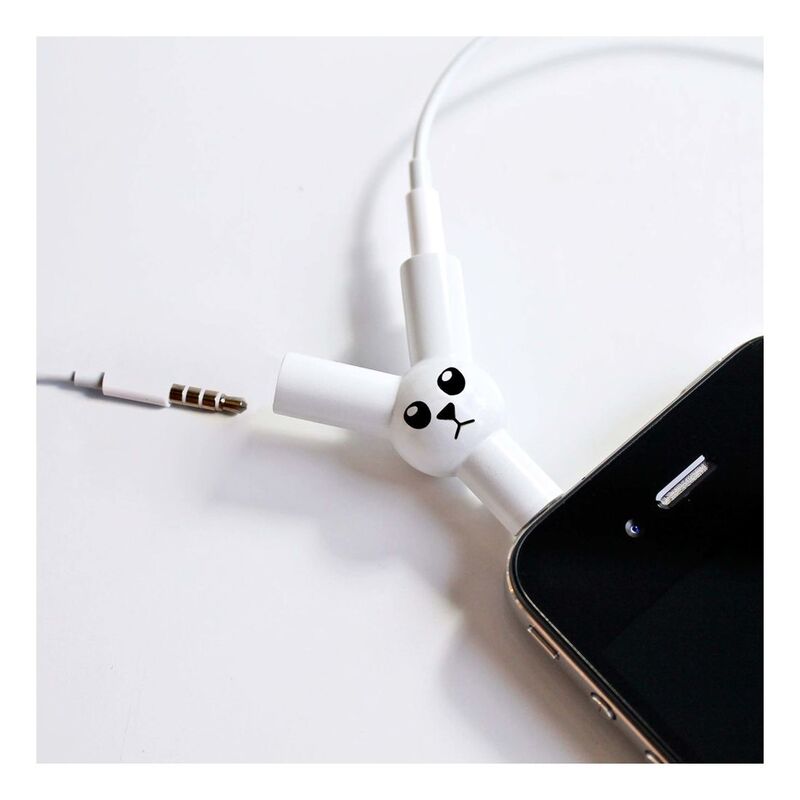 A new sociable way to be anti-social, share your music in full stereo and not just in one ear. No longer will you just hear the drum beat while your friend gets the awesome guitar solo. With Jack Rabbit Headphone Splitter you both use your own headphones but listen to the exact same song, at the exact same time, from the exact same device. Just plug 2 pairs of headphones into the Rabbit's ears. Fully compatible with the controls and mic on iPhone and other devices.