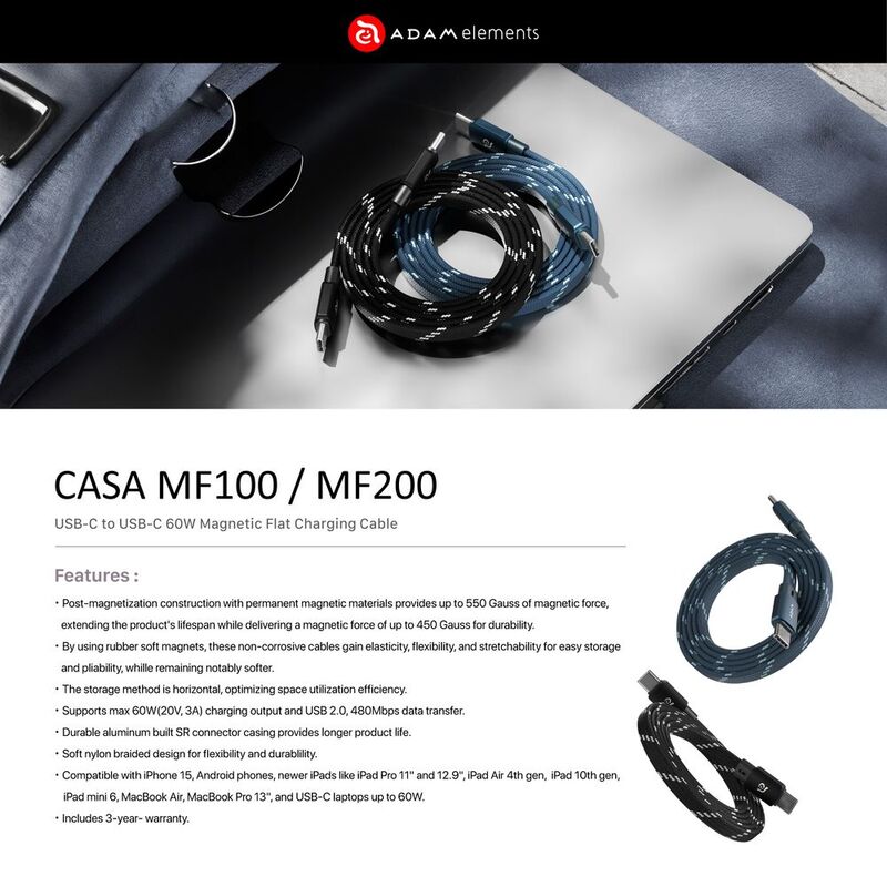 Adam Elements Casa MF100 USB-C To USB-C 60W Magnetic Flat Charging Cable 1M - Black