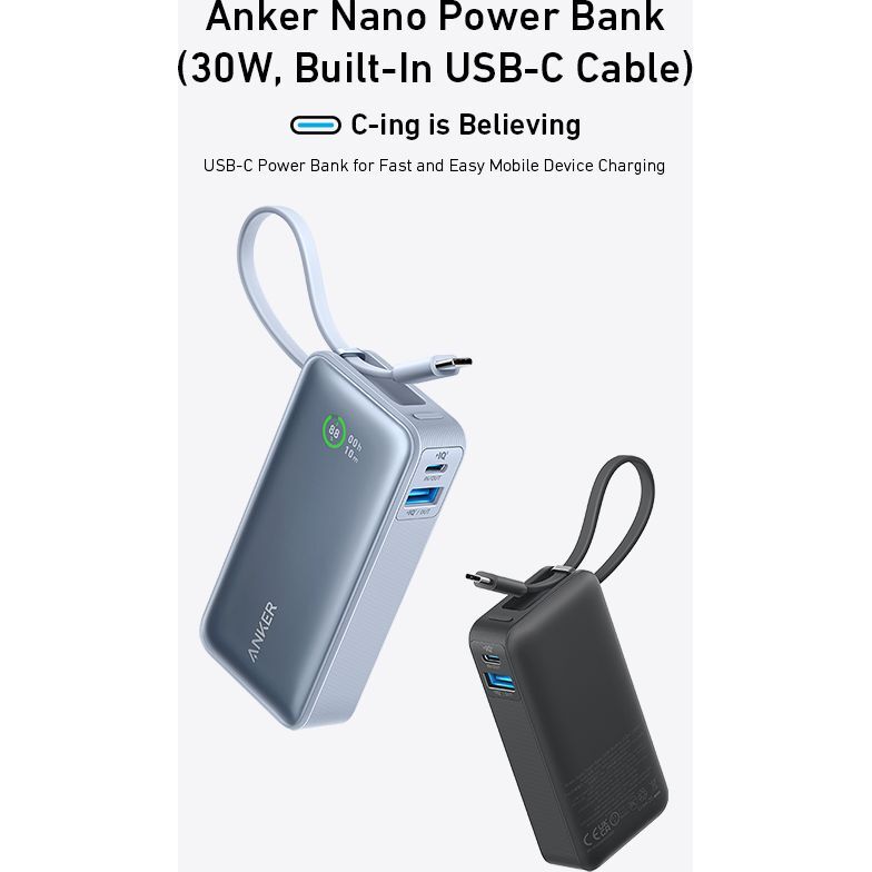 - 60% more power than PD 18W for an efficient charge. Supports 30W fast charging via the built-in USB-C cable or USB-C port, allowing you to recharge the power bank in just 80 minutes.