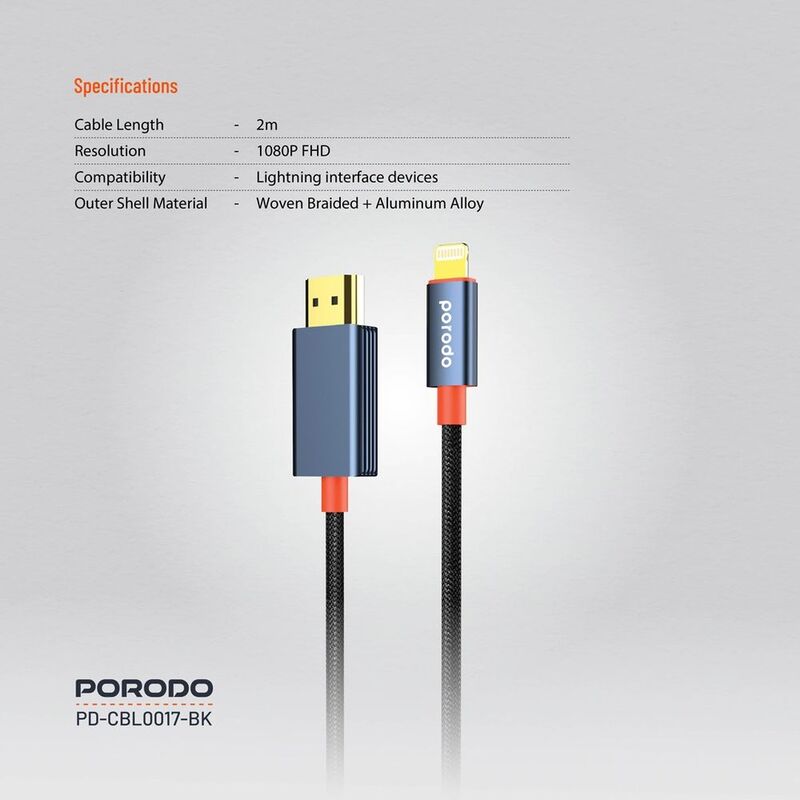 Designed by experts with seamless connectivity in mind, the Porodo Woven Cable Lightning instantly transforms your viewing experience to HDMI. Made from a combination of woven braided material and aluminum alloy, this is durable and looks stylish, offering a premium feel to any setup. It is an impressive 2-meter length and provides ample reach to comfortable viewing without the hassle of tangling. Compatible with any Lightning interface device, it makes perfect use with any effort in connecting your iPhone or iPad to your TV or projector. You'll enjoy super-bright visuals at 1080p Full HD resolution that display crystal-clear images from movies, presentations, and gaming. With plug-and-play functionality, it will be easy to hook up and start streaming in seconds. Take your media experience to the next level with the Porodo Woven Cable Lightning to HDMI, where convenience meets quality.