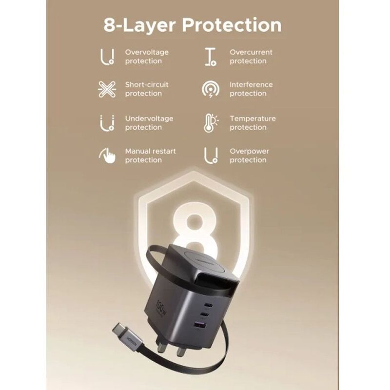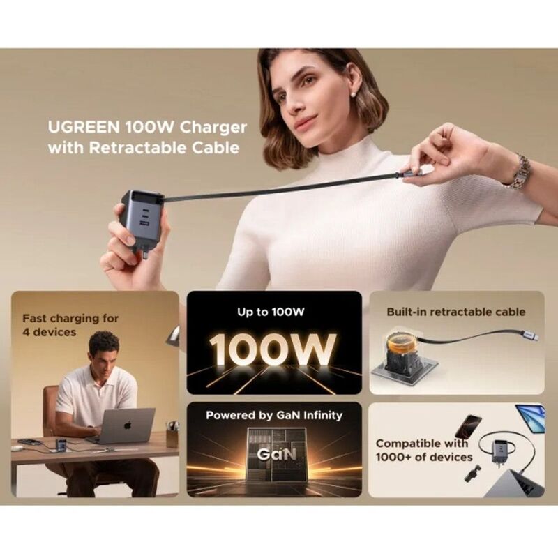 Ugreen 100W Gan Fast Charger With Retractable Cable - Grey