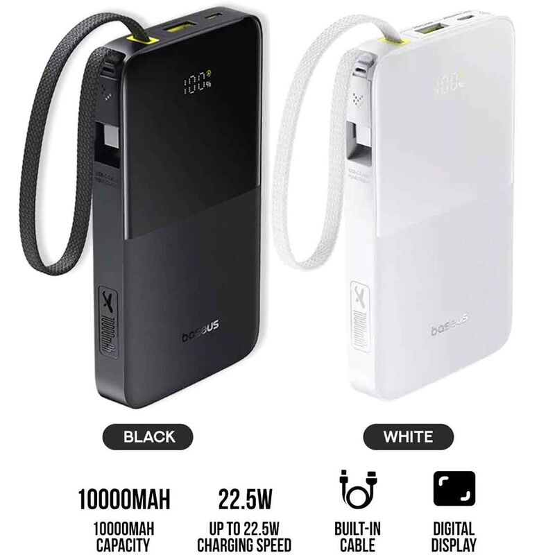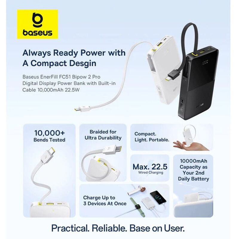 Power up anywhere with the Baseus EnerFill Bipow2 Pro 10000mAh Power Bank. Featuring 22.5W fast charging, a built-in nylon braided USB-C cable, and real-time digital battery display, this compact charger is designed for ultimate convenience and performance. Ideal for travel, commuting, or daily use, it charges up to 3 devices simultaneously and supports low current mode for earbuds and wearables. Certified safe and TSA-approved, it's your must-have on-the-go power solution.
