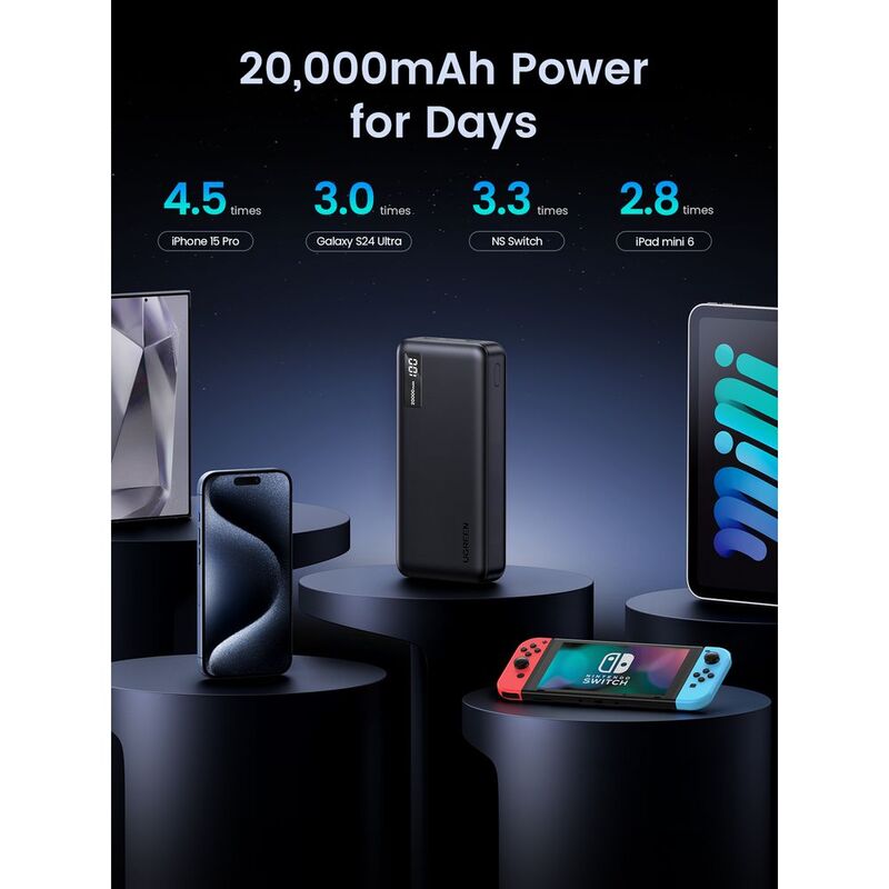 - UGREEN PowerBank 20000mAh 20W PD Fast Charging LED Display USB-C 20W + 2xUSB-A 22.5W Gray