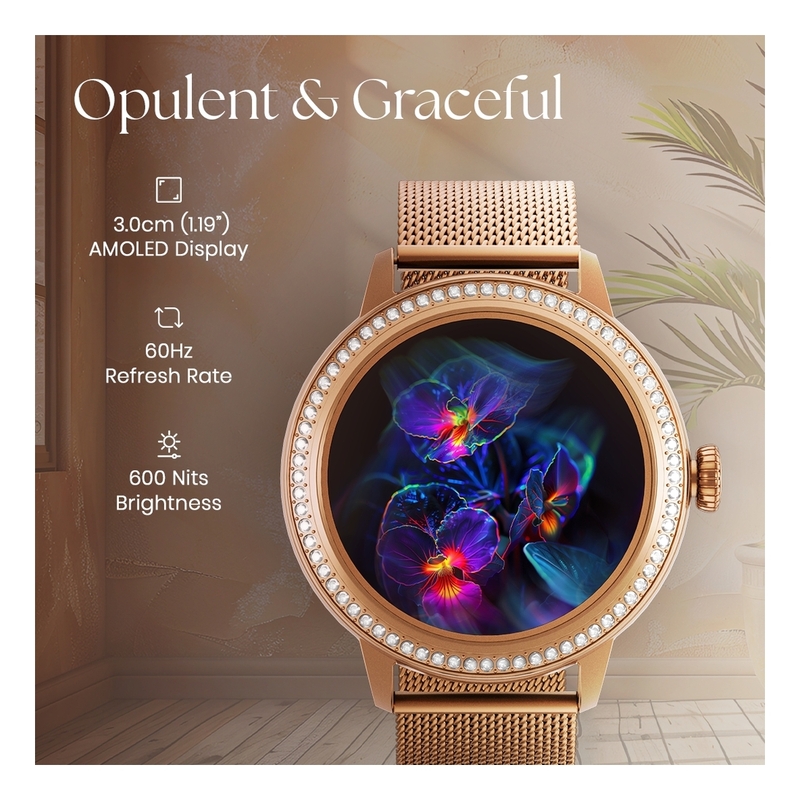 • Titan Valerie Womens Smartwatch combines style and functionality with its sleek SS 316L stainless steel construction and vibrant 3.04 cm AMOLED display. Designed for modern women, it features SingleSync BT calling, an AI voice assistant, and womens health tracking, including a skin temperature sensor and menstrual cycle monitoring. Its array of wellness features includes sports records, breathing exercises, and more, while practical tools like weather display, camera and music control, alarms, and timers keep you on top of your day. With customizable 3D watch faces and elegant design, it seamlessly integrates technology and fashion into your life.