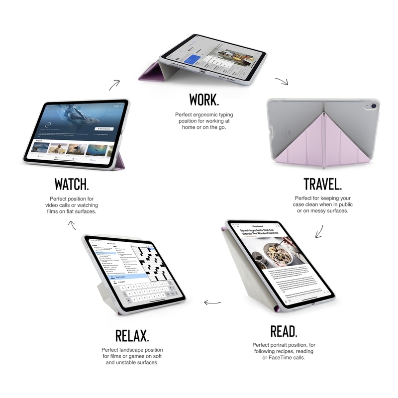 • 5-IN-1 STAND POSITIONS - 2x Stand positions for typing and viewing; 2x additional wide-base positions and 1x further portrait position.