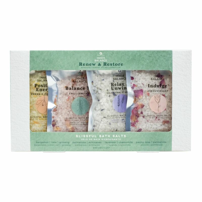 - Contains four products: x1 Balance Me Bath Salts, x1 Relax and Unwind Bath, 1x Positive Energy Bath Salts, x1 Indulge Bath Salts