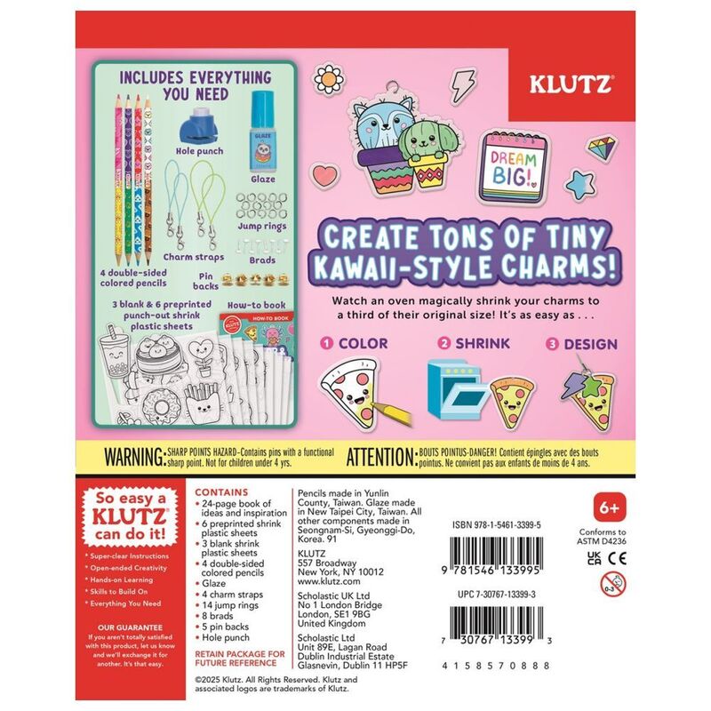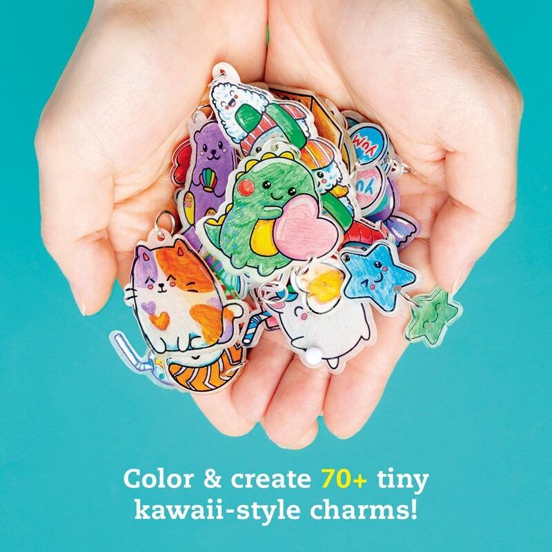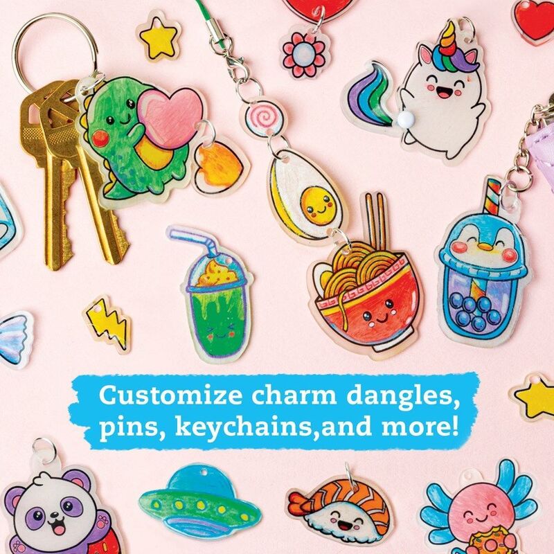 Make it cute and small with shrink art! Color, and shrink adorable kawaii-style creations. Choose from over 70+ punch-out designs from our printed shrink art plastic, or trace your own with activities from the book. Use the hole punch to connect charms. You can make charms that hang together or charms with parts that move (like tails that wag). With everything you need to get coloring and crafting right out of the box, this kit includes over 70 punch-out designs from our printed shrink art plastic, 3 additional blank sheets to trace designs from the book, a cute hole punch, double aided pencils with 8 colors, glaze, 5 pin backs, 8 brads, 14 jump rings, and 4 charm straps. If you can think it, you can shrink it!