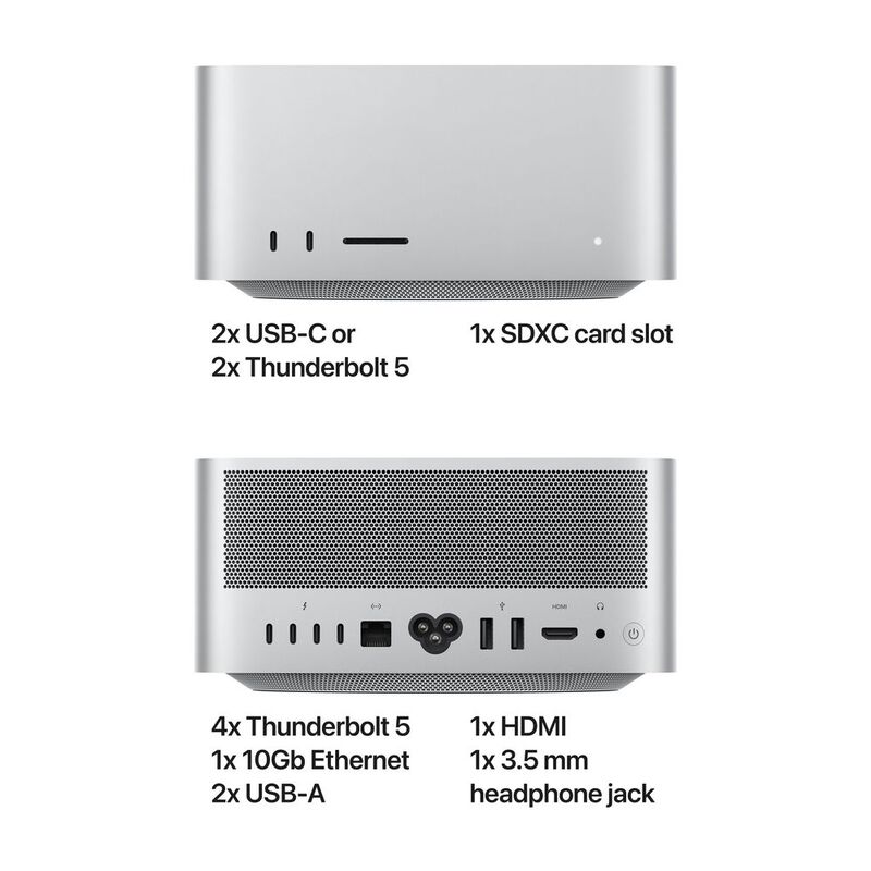 - POWERFUL CONNECTIONS - Mac Studio features up to six Thunderbolt 5 ports and two USB-A ports, an HDMI port, an SDXC card slot, and a headphone jack. Drive up to five external displays with M4 Max or eight with M3 Ultra.
