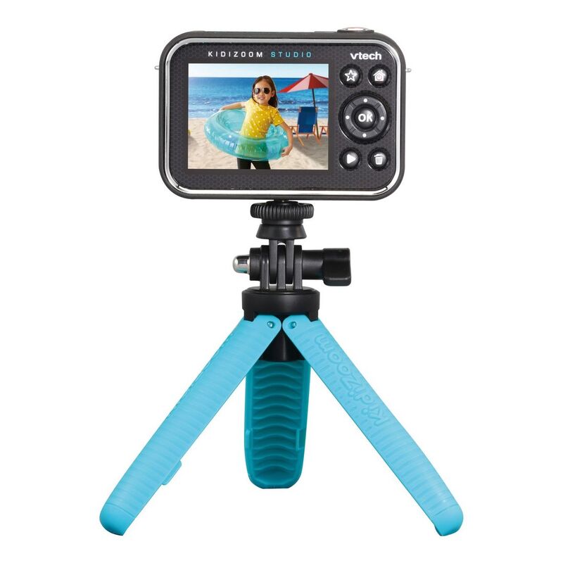 Be the star of your own video universe with the KidiZoom Studio by VTech®! Complete with green screen to create special effects, this high-definition video camera kit comes with everything you need to create the show of your dreams. Set up the included tripod to film your very own unboxing videos or use the flip-up lens and handle to capture the perfect on- the -move selfie video. Pretend to host a show, give tours, create disappearing illusions and trick shots, or shoot how-to videos. Use the 20 included animated backgrounds to set the stage for all your video adventures. Let your creativity loose!