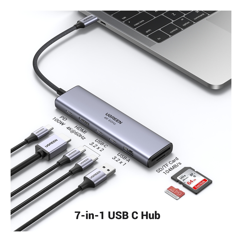 - Powerful Charging Capability The UGREEN 7-in-1 Hub supports charging up to 100W, providing fast and efficient power delivery to your devices while ensuring other peripherals stay connected. Keep your devices powered without the need for extra adapters.