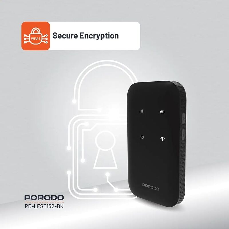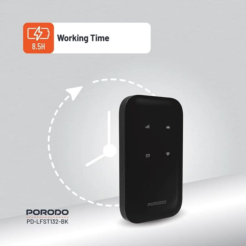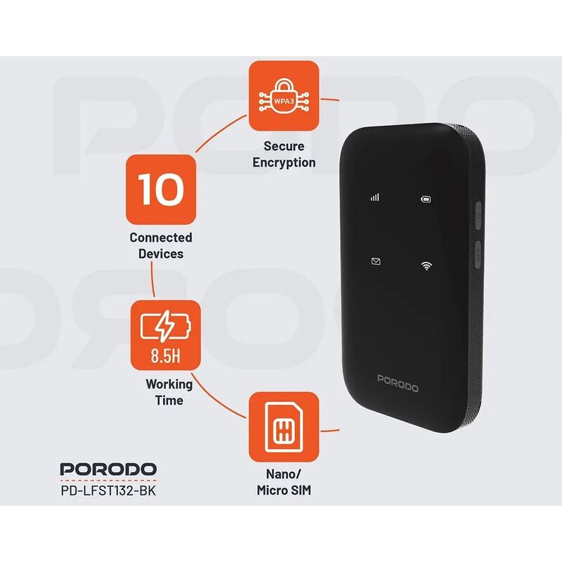 Porodo Pocket Router 4G LTE | WiFi 6 offers steady and fast internet access anywhere. It has a ZX297520 V3 CPU to offer silky-smooth performance for all the browsing and streaming work. It boasts a 3000mAh battery capacity that can provide you with up to 8.5 hours of non-stop usage and charges conveniently through a Type-C port. Experience scorching 4G LTE speeds of 150Mbps download and 50Mbps upload, and 286Mbps WiFi speeds in the 2.4GHz band. The router is capable of handling many supported bands, including 4G FDD-LTE, TDD-LTE, and 3G WCDMA. The router also includes WiFi 6 with enhanced connectivity and security features, with the support of WPA3 encryption. The Porodo Pocket Router supports up to 10 devices simultaneously, which is ideal for office or family use. Portable and accommodating Nano/Micro SIM, it is also ideal for travel.
