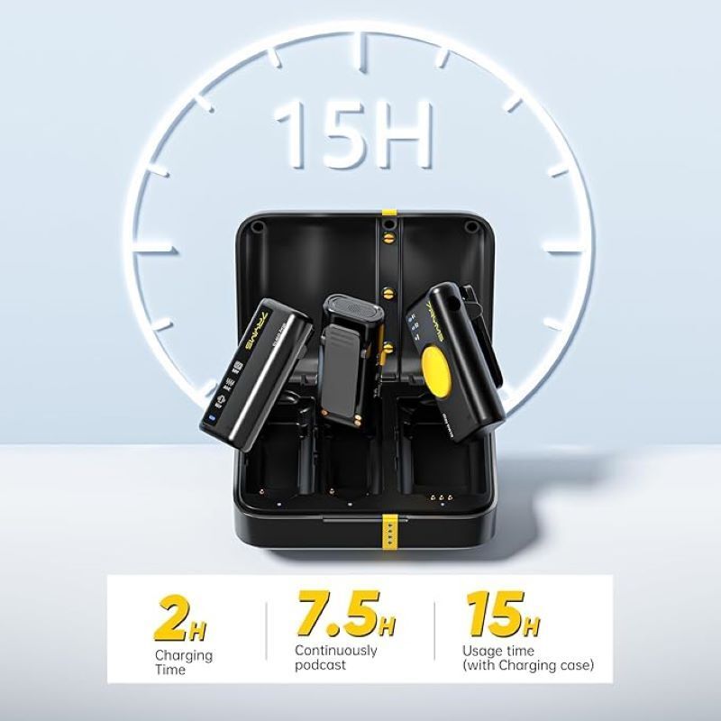 • 15-Hour Life Charging Case: Each transmitter of the DW10 wireless lavalier microphone provides 7.5 hours of battery life, a total of up to 15 hours of charging case. Both microphone TX and RX feature USB-C charging ports, allowing you to charge while using