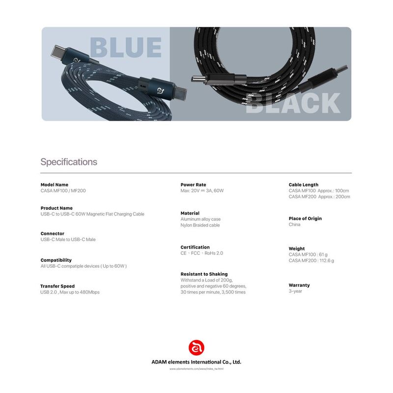 Adam Elements Casa MF200 USB-C To USB-C 60W Magnetic Flat Charging Cable 2M - Black
