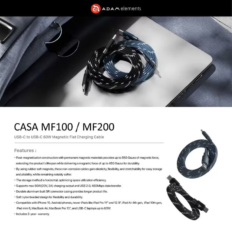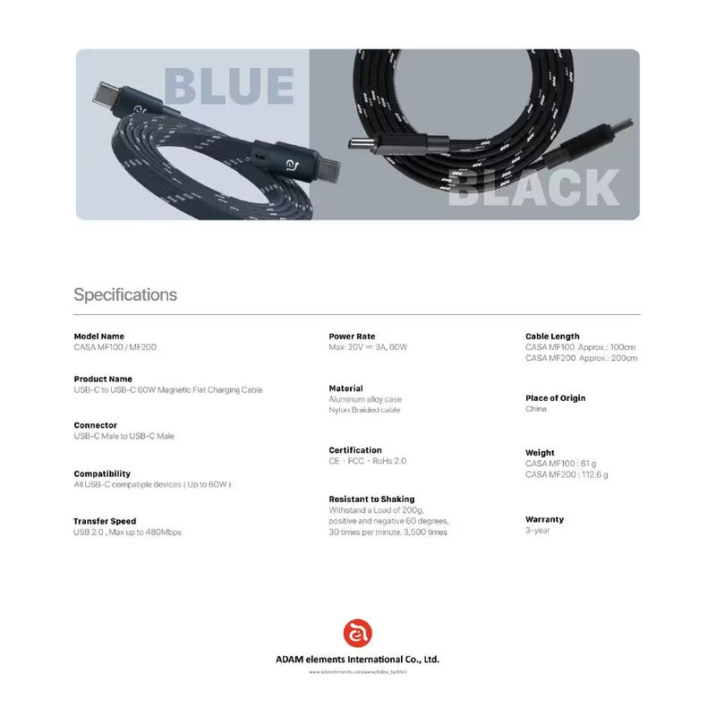 Adam Elements Casa MF200 USB-C To USB-C 60W Magnetic Flat Charging Cable 2M - Blue