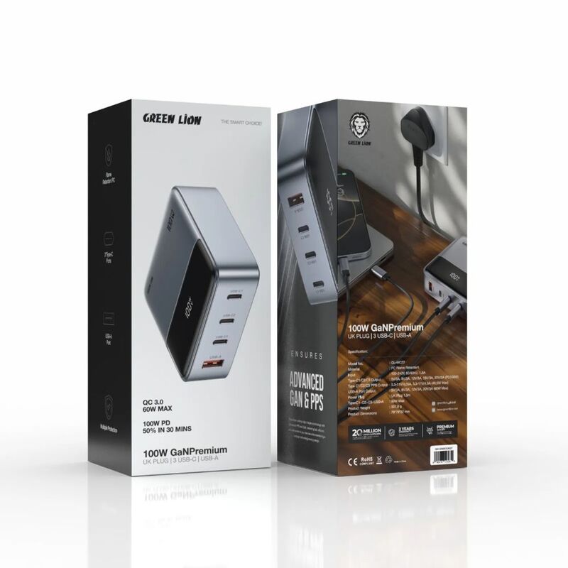 Green Lion 100W Gan Premium UK Plug Adapter - Grey