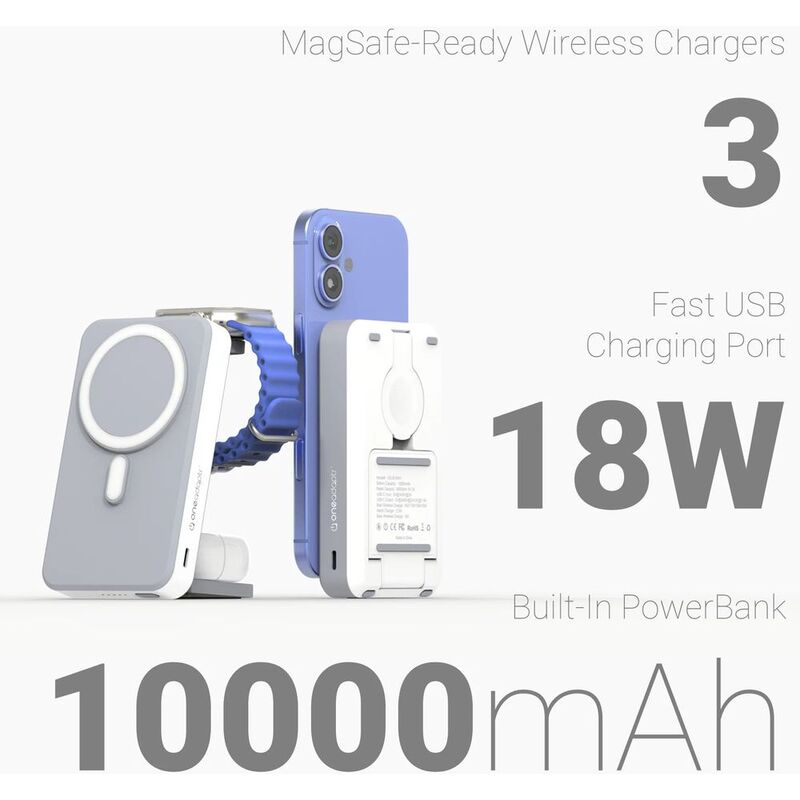 Meet The New OneGo: Introducting the all new OneGo, world's first wireless charging stand powerbank designed for home and travel use. 15W MagSafe-Ready wireless charger, 2W Apple watch and 5W wireless chargers cover all the charging needs for your Apple devices in one place including the latest Apple iPhone 16/16 Pro, Watch and Airpods. Eliminating uncessary cables. Detachable 15W and 2W charges packs with a built-in 10000mAh powerbank, keeps your devices powered on the road.