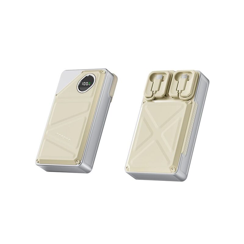 A high-capacity power bank with built-in Type-C and Lightning cables, designed for fast, efficient charging of multiple devices simultaneously.
