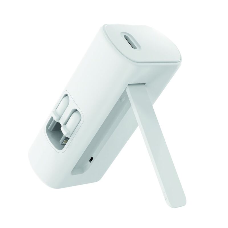 Swiss-Designed, this 20W PD 3-in-1 digital display rapid charge power bank is designed to meet urgent power needs while traveling! Compact in size (7.9 x 3.8 x 2.3 cm) and lightweight (98g), it can charge 2 devices simultaneously. The foldable USB-C and Lightning connectors eliminate the need for extra charging cables, allowing for direct connection to your phone or electronic devices for fast charging. It features a built-in 20W PD 3.0 USB-C port (IN/OUT ), which can also charge additional devices. The digital display shows the remaining battery power. The foldable stand, which can be used as a stand while charging, makes this device an essential travel accessory. One-year international warranty.