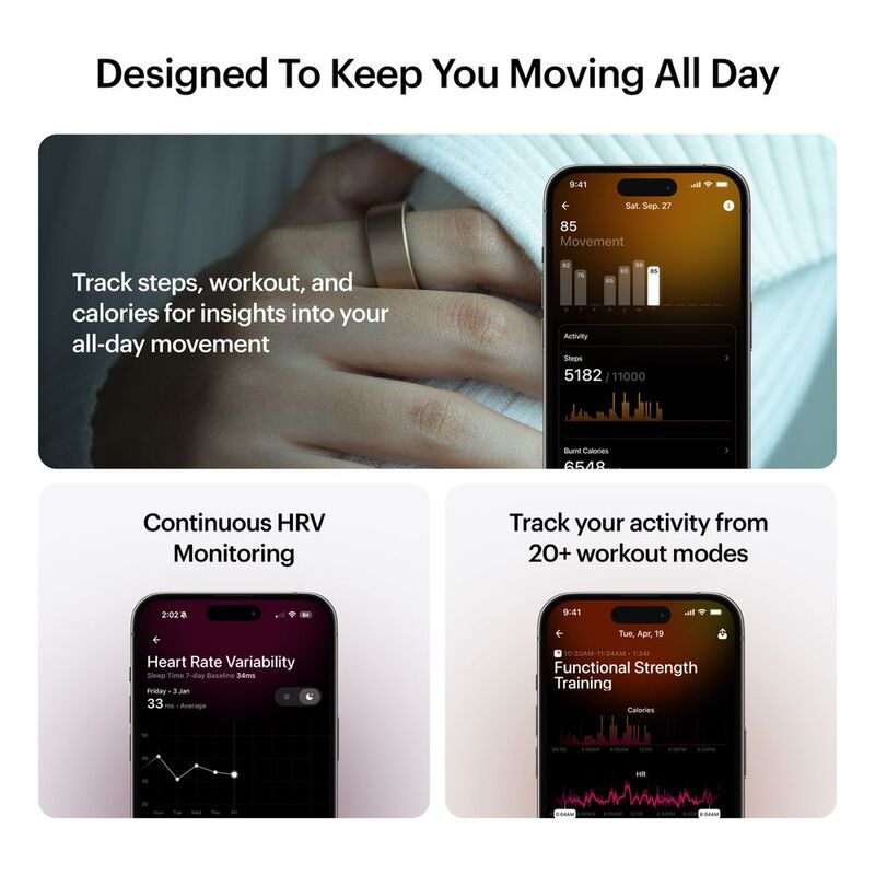 With the right nudges and biofeedback, it helps you stay active and optimize for better cardiovascular functioning. Developed to help you get in more movement, more often, Ring AIR also helps you track your steps, calories, and workouts