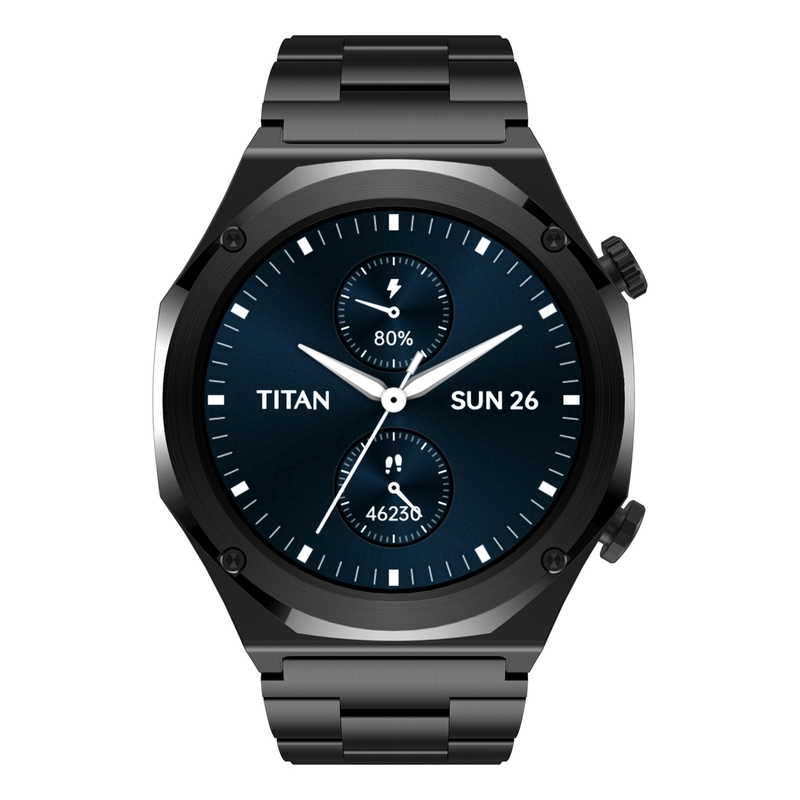 - Titan Maestro Premium Smartwatch features a 3.6 CM AMOLED display with 466x466 resolution housed in a sleek, durable 3-piece all stainless steel construction. Designed for both style and functionality, it offers customizable 3D watch faces and a functional crown for effortless navigation. With SingleSync™ BT Calling and an AI Voice Assistant, staying connected is easier than ever. Equipped with comprehensive wellness features like sports records, breathe exercise, and sleep tracking, it supports a balanced lifestyle. Smart tools such as camera and music control, sound and vibration settings, DND mode, screen-on time adjustment, and Find Phone ensure convenience and personalization at every step.