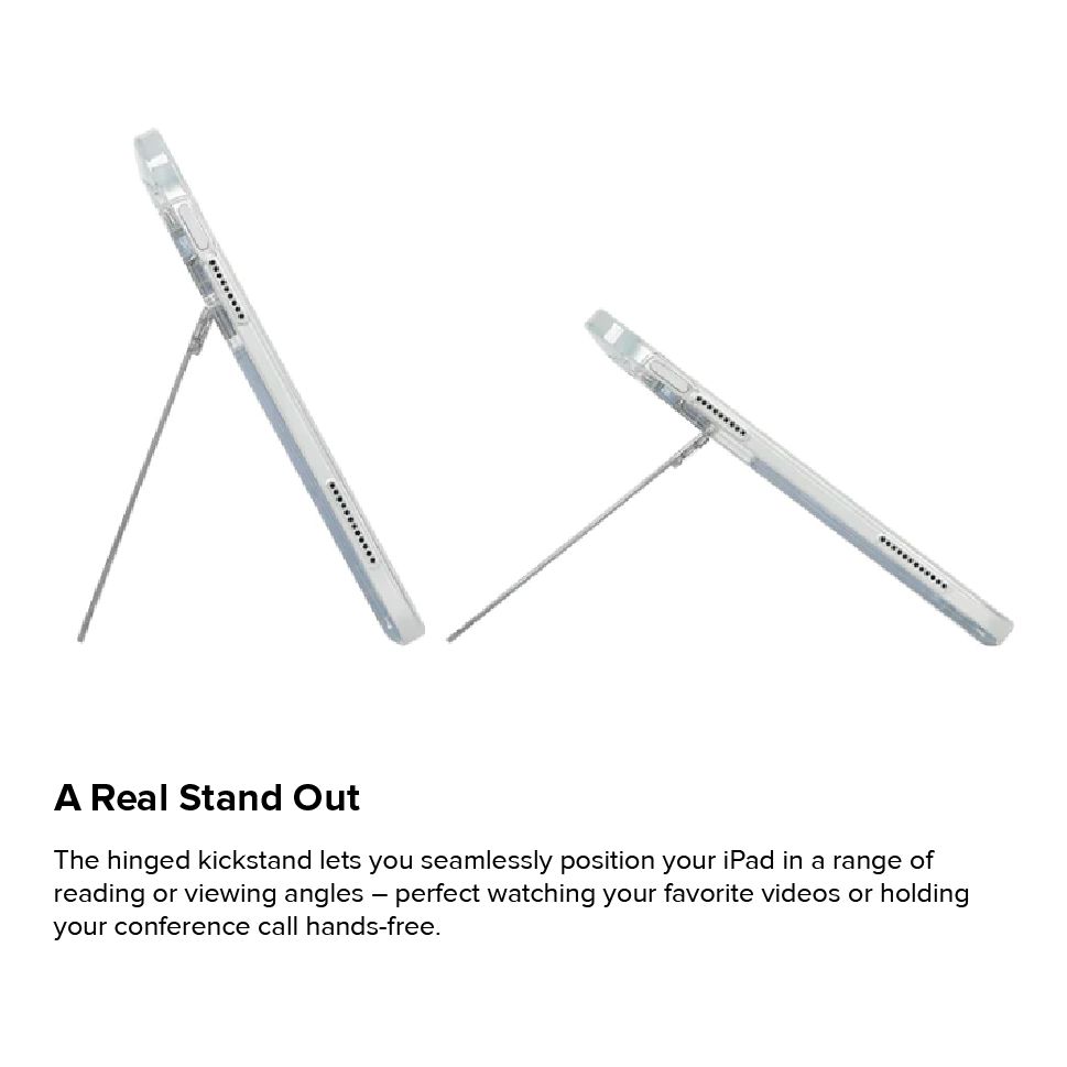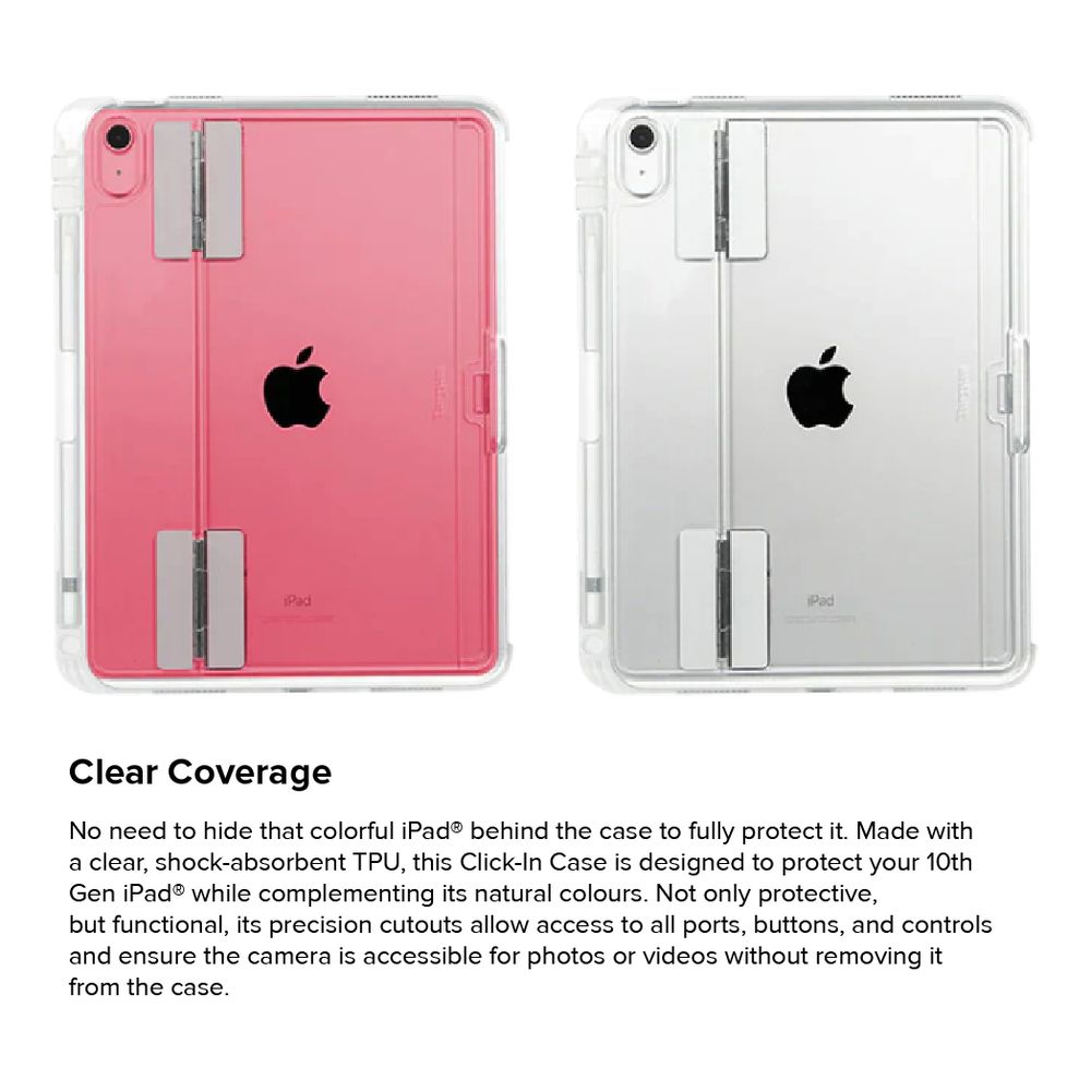 Let your iPad stand out with the Targus® Click-In™ Clear Case + Kickstand for iPad (A16) and iPad (10th Gen) 10.9-inch. Complement your colourful new iPad with this clear case that’s engineered for durability without the extra weight. Featuring a shock-absorbent tray with wrap-around bezel and reinforced corners, it delivers military-grade drop protection (up to 4 feet/1.2 meters)* in a slim design. Its built-in kickstand flips out to offer hands-free viewing in multiple angles while in landscape mode, making it easy to watch the screen at nearly any angle. Plus, enjoy added efficiency with an integrated holder for your Apple Pencil® or stylus (Pencil sold separately by Apple®).