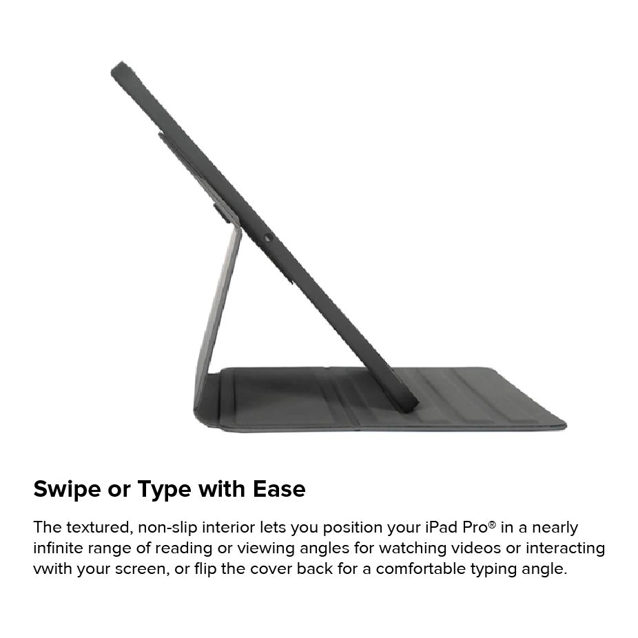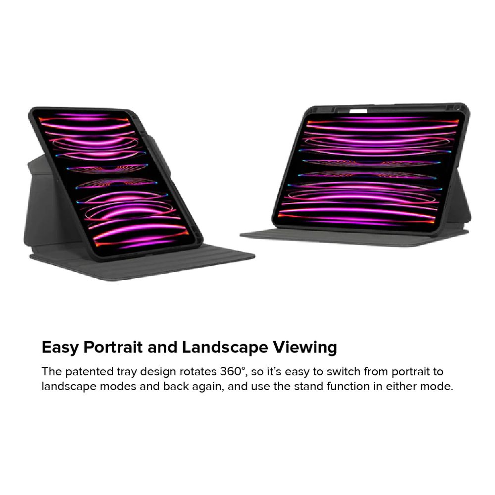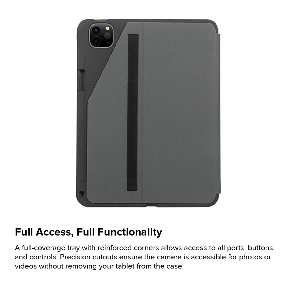Wrap your iPad Pro® 11-inch (M4) in strong, military-grade drop protection. Engineered for durability without adding weight, the Targus® Click-In™ Rotating Case features a custom-moulded tray that delivers all-around protection and rotates 360° to switch easily between portrait and landscape viewing. The tray is structurally designed to redirect sound for enhanced audio. Plus, precision cutouts give full access to controls, ports, and cameras. Enjoy added efficiency with an integrated loop for your Apple Pencil® or stylus. The structured cover is engineered to protect, while a non-slip interior makes it easy to adjust your device into infinite viewing angles or a comfortable typing position. Altogether, this 11-inch iPad Pro case is a superior choice for protecting your tablet.