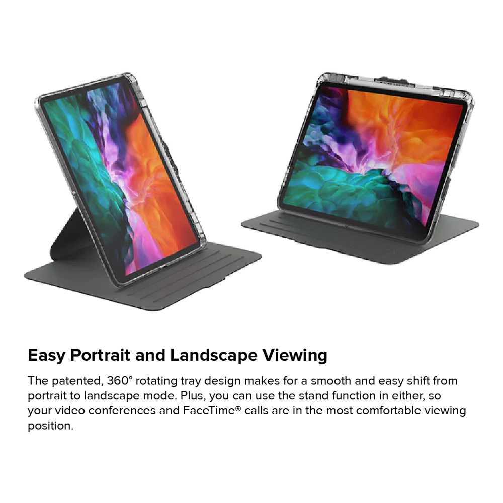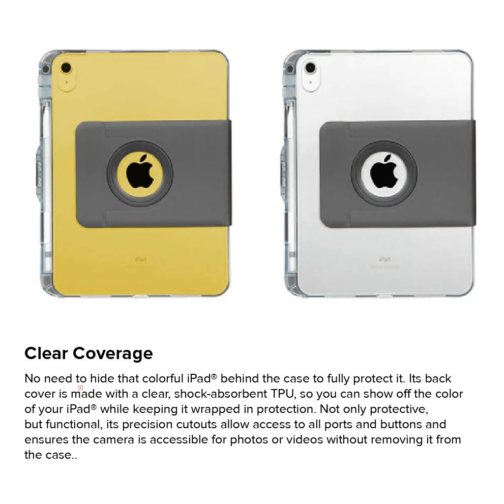 Complement your colourful new iPad with the Targus® VersaVu® Clear Case for iPad (A16) and iPad (10th Gen) 10.9-inch - a case designed for protection and versatile viewing. Featuring a shock-absorbent tray with wrap-around bezel and reinforced corners, plus a protective folio cover to safeguard the screen, the case delivers military-grade drop protection (up to 4 feet/1.2 meters)* in its sleek design. The VersaVu’s patented 360° rotation creates virtually any positioning option and transitions smoothly between portrait and landscape to customise your view. Deep grooves anchor the edge to ensure stability, and precision cutouts give you easy access to all your buttons, ports, and camera lenses. Enjoy added ease and convenience with the integrated holder for your Apple Pencil®, keeping it ready to go or your stylus close at hand (Pencil sold separately by Apple®). And thanks to its structural design, this case also has audio-boosting scoops, so you’ll have premium sound whether you’re taking a call, in a meeting, or streaming your favorite program.