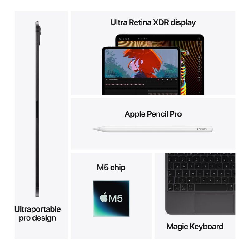 iPad Pro, powered by the Apple M5 chip, delivers outrageous performance for effortless productivity and advanced AI workflows. With a stunning Ultra Retina XDR display, superfast Wi-Fi 71 and 5G Cellular,2 Neural Accelerators for AI workloads, and a redesigned iPadOS, there’s no limit to what you can do with iPad Pro. Paired with Apple Pencil Pro and Magic Keyboard for iPad Pro, it brings endless versatility, creativity, and productivity to your fingertips.