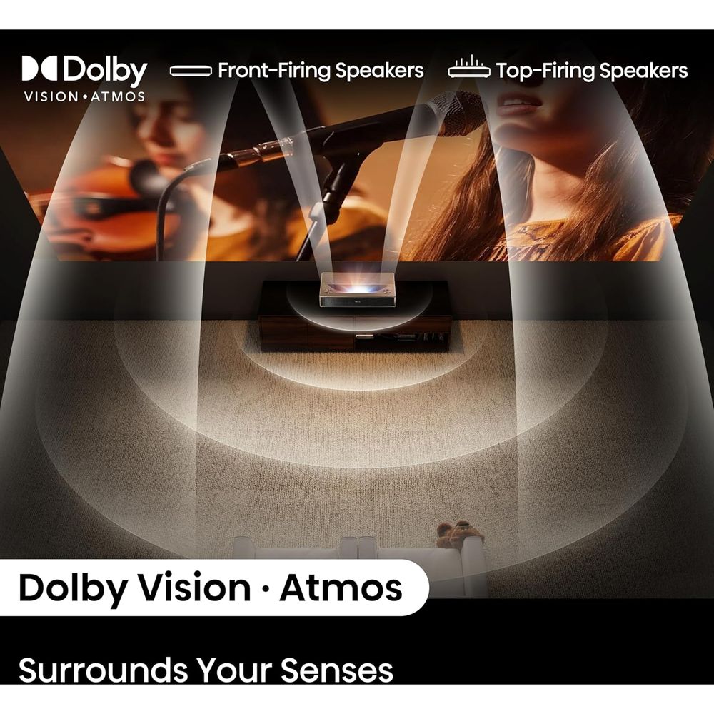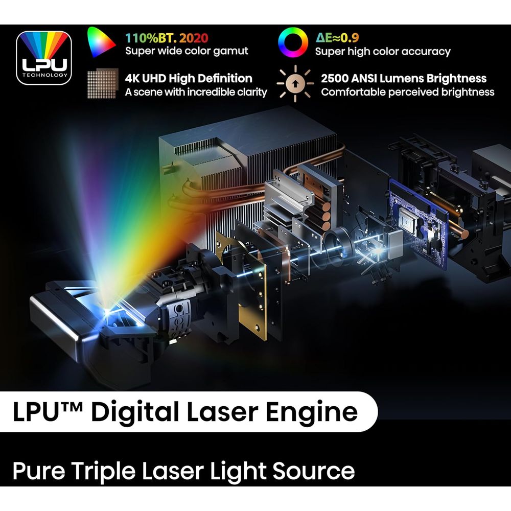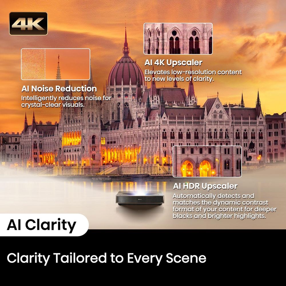 • The sophisticated DLP system controls 2.07 million micro mirrors to deliver sharp 4K pictures up to 150'', while the AI 4K Clarity provides finely-detailed visuals and crystal-clear precision in every pixel. AI 4K Upscaler Elevates low-resolution content to new levels of clarity. AI Noise Reduction Intelligently reduces noise for crystal-clear visuals. AI HDR Upscaler Automatically detects and matches the dynamic contrast format of your content for deeper blacks and brighter highlights.