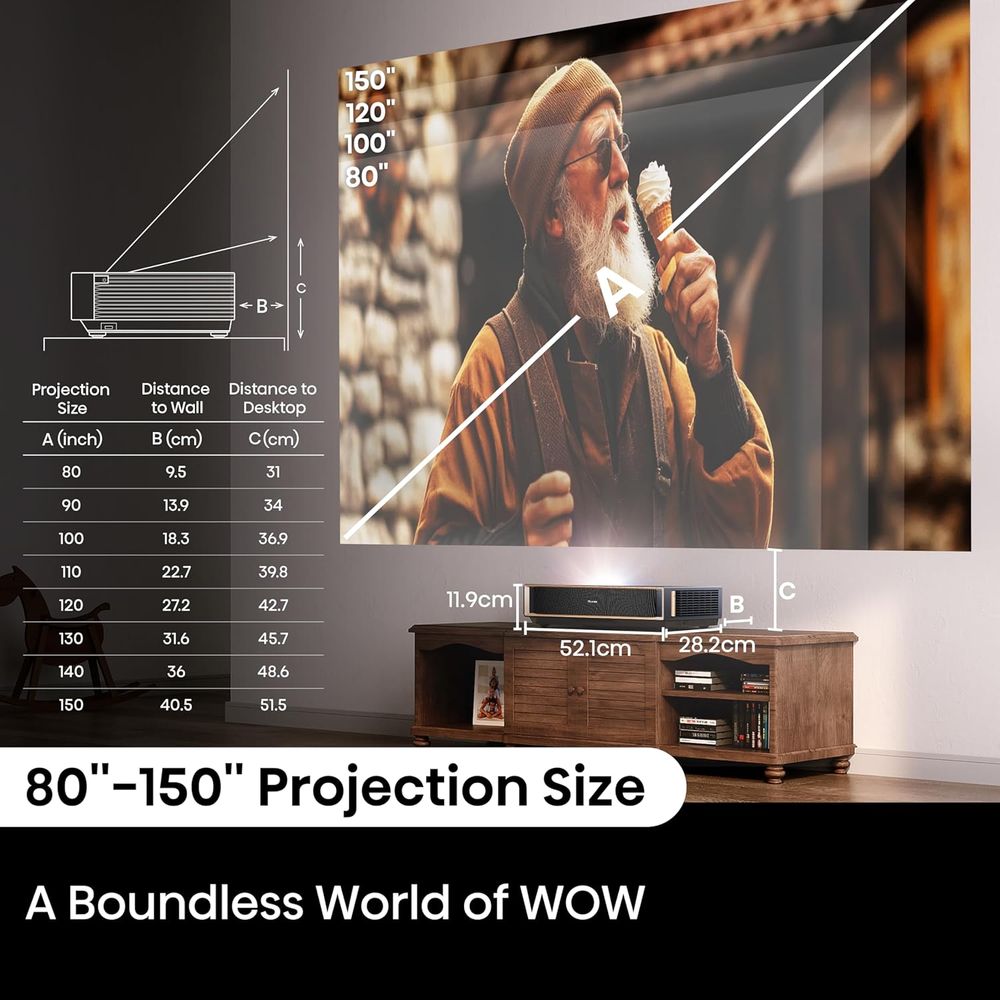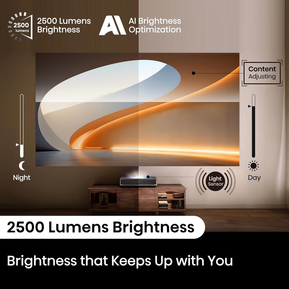 • Dive into a world where lights dazzle and shadows deepen. With a stunning 2500 ANSI Lumens brightness, every subtle detail emerges with clarity. The advanced AI Light Optimization dynamically adjusts brightness to match your surroundings and content, ensuring a perfectly vibrant yet comfortable viewing experience.