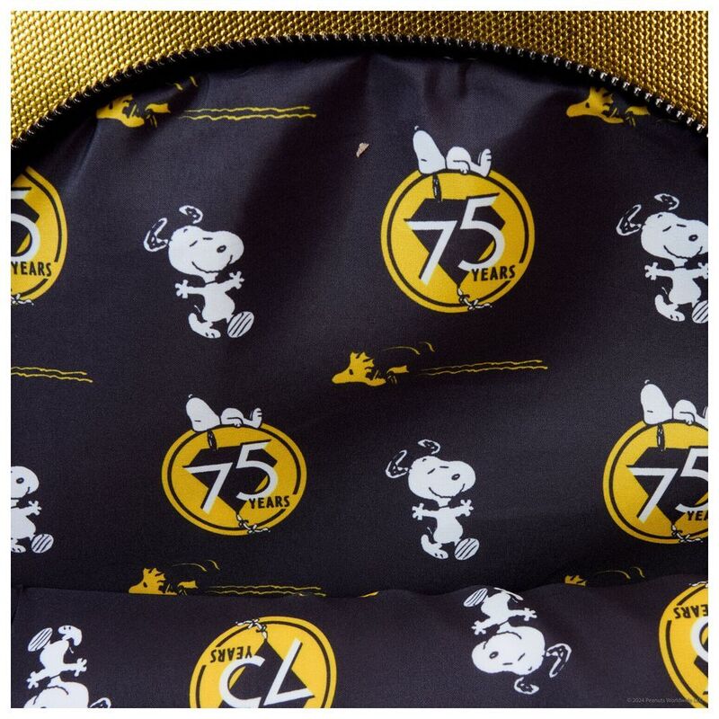 Happiness is…a big celebratory feeling you can take with you wherever you go. Celebrate the 75th anniversary of Peanuts™ with our mini backpack featuring the whole gang. You’ll be able to spot the embroidered silhouettes of Charlie Brown and his friends against a black background on the front pocket. Charlie Brown is flying a kite, and his characteristic wavy line on his shirt appears below. The signature yellow on his shirt appears above as a shiny, textured detail. The wavy line makes an encore as a die-cut feature, forming the top handle above. Flip the backpack around, and you’ll find the words “Happiness is…75 years.” Pack your daily essentials to commemorate a milestone anniversary and add a little character of your own.