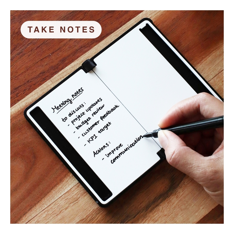 - MEMO’s heart is its whiteboard. It spans 6 inches diagonally, over A7 size. Useful in a lot of cases. Jot down ideas. Make a drawing. List your tasks. Note important reminders. The list goes on. The aluminum whiteboard is special. Our special heat-curing whiteboard paint ensures smooth writing. No squeaky sounds. Remarkably easy to wipe away. It folds closed magnetically, making sure there is no smudging and no staining. A reusable notepad and pen right in your pocket.