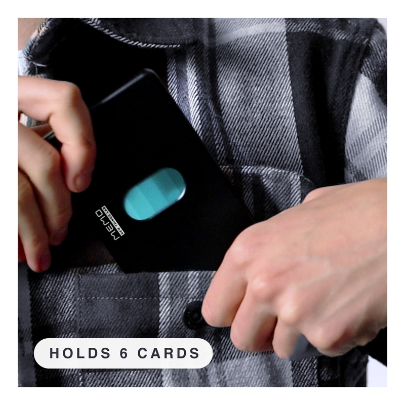 - MEMO is a capable wallet. It organizes cards effortlessly. Store up to 6 cards securely. Up to 3 cards per side. Quickly access them by sliding your thumb. Special, wear-resistant rubber elements grip your cards tightly. No risk of slipping out. Tested for compatibility with cards from all over the world. Plus, MEMO’s aluminum shell is a robust RFID blocker. Your (credit) card information stays protected.