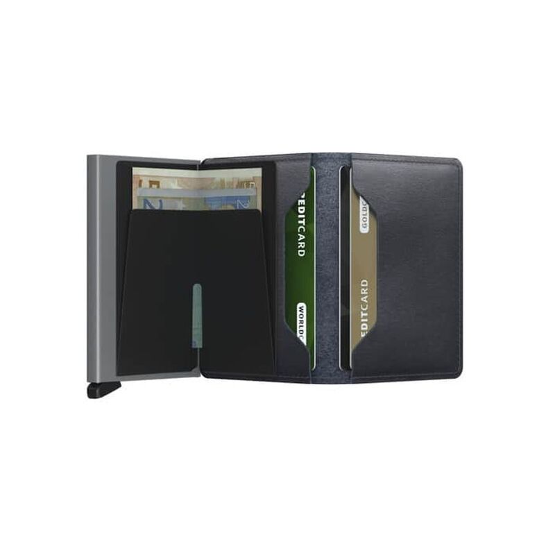 Slimwallet leather is cut wider than the leather of the Miniwallet, providing space for extra cards, bills, business cards, and receipts. The Slimwallet is less suitable for coins.
