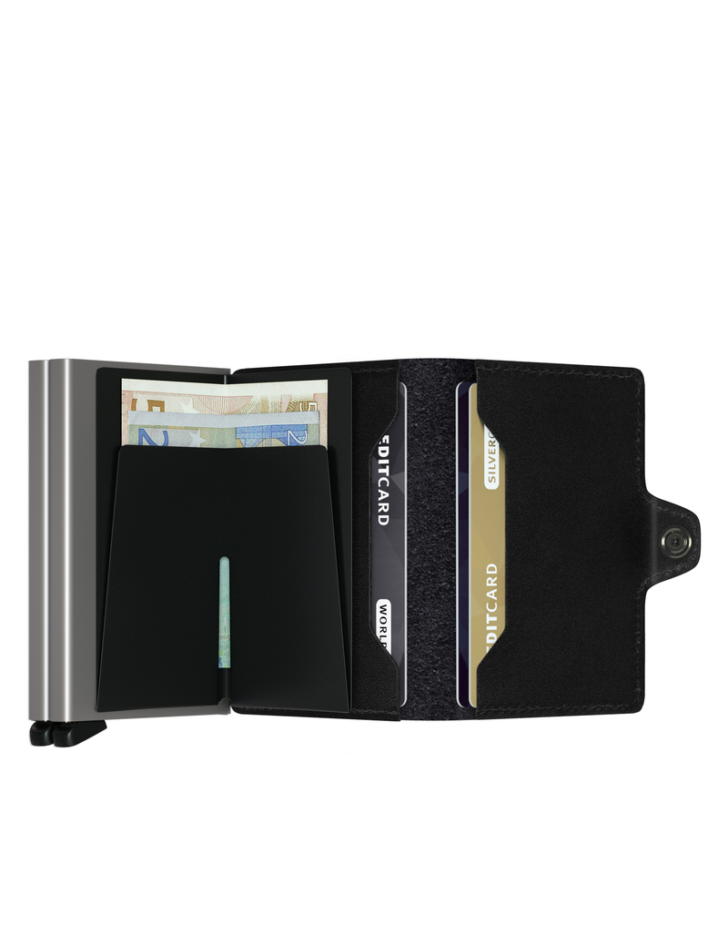 The Twinwallet consists of two Cardprotectors in a leather pouch with press stud closure. With the Twinwallet, you can securely take eight to twelve cards with you. The interior also offers space for extra cards, paper money, receipts, business cards and coins.