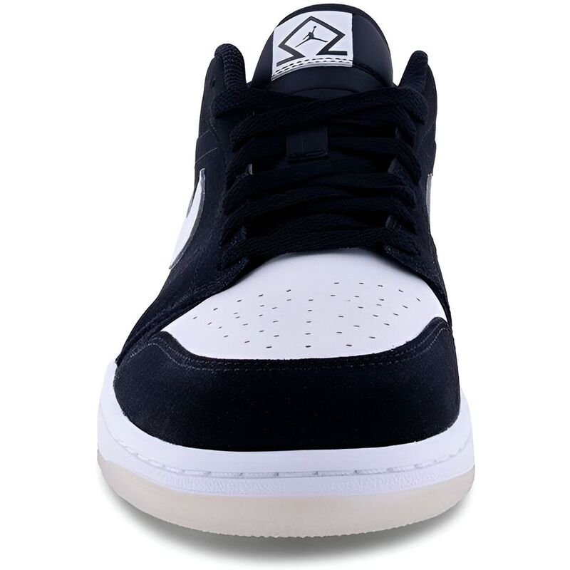 The Jordan 1 Low Diamond Shorts features an elegant black Durabuck and white leather upper in a classic color block, reminiscent of iconic Jordan 1s like Bred and Shadow. An Air Jordan Wings logo graces the heel, while the white midsole and semi-translucent outsole complete the exceptional look.