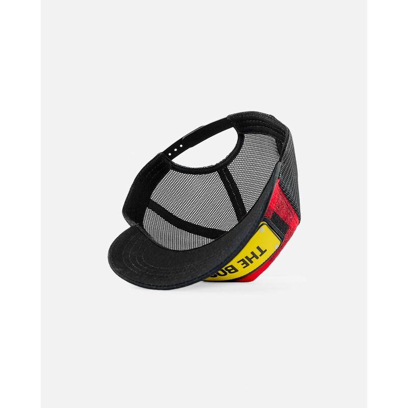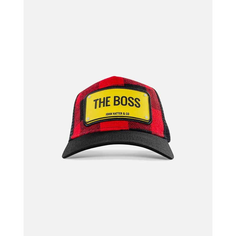 - Red and black checkered flannel trucker cap with bold "THE BOSS" statement in yellow