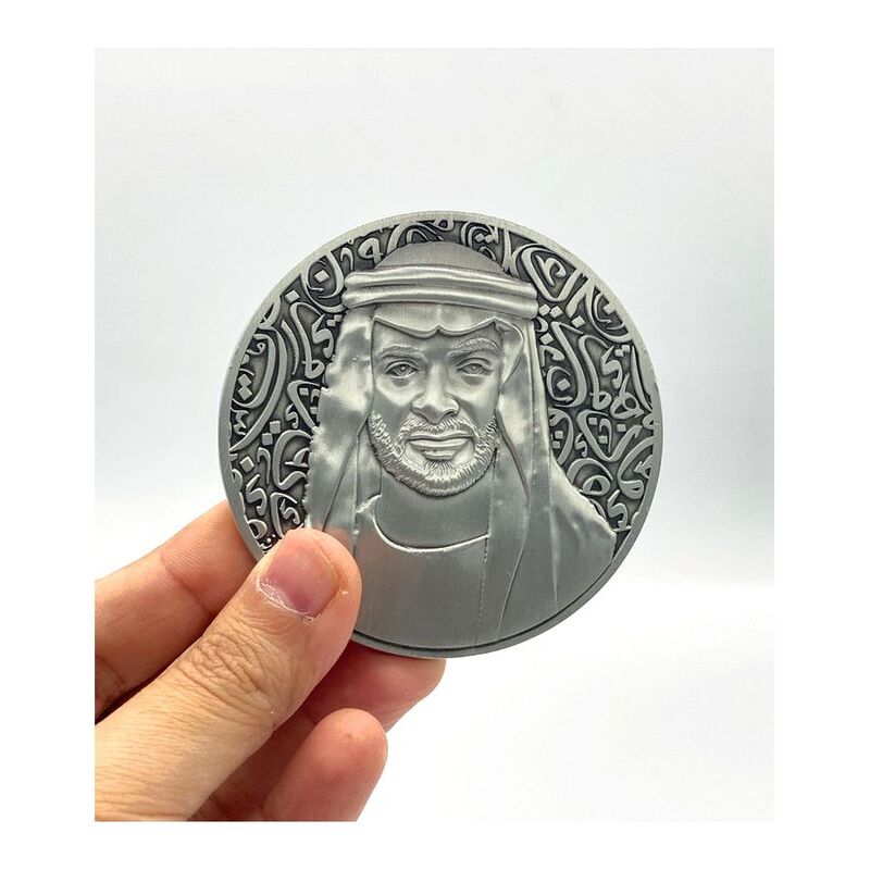 A solid metal commemorative coin with the image of our late Sheikh Zayed bin Sultan Al Nahyan in a distinctive 3D design.