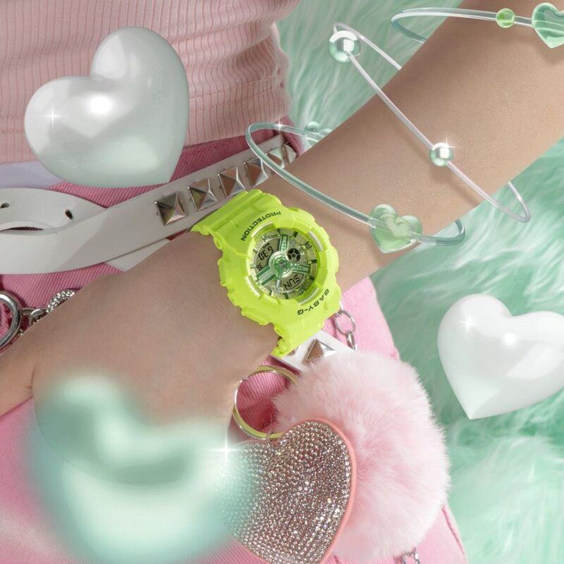 We start with the popular BA-110, then dress it up with a dimensional dial to create a captivating watch face that highlights the complex interplay of various parts. The gear-inspired hour hand and bridge components feature a subtle heart motif. These singular details make this colorful Y2K-styled accessory really pop.