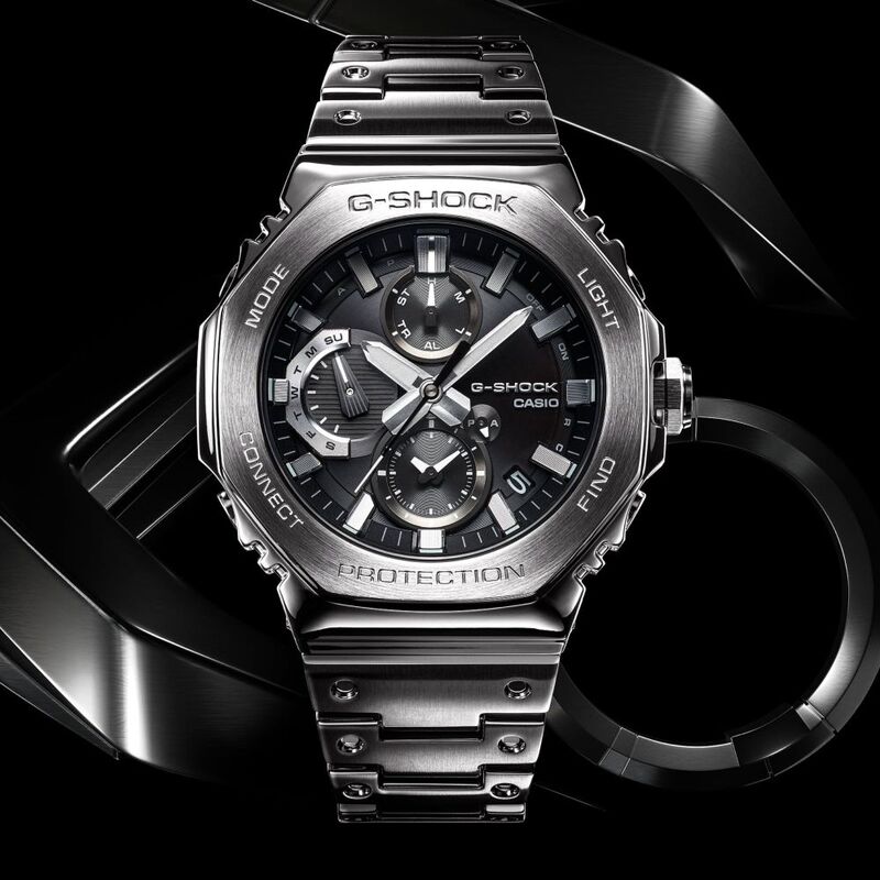 We take it way back with the octagonal bezel and dimpled band design of the original from 1983, but all done in metal with stainless-steel case, bezel, and band.