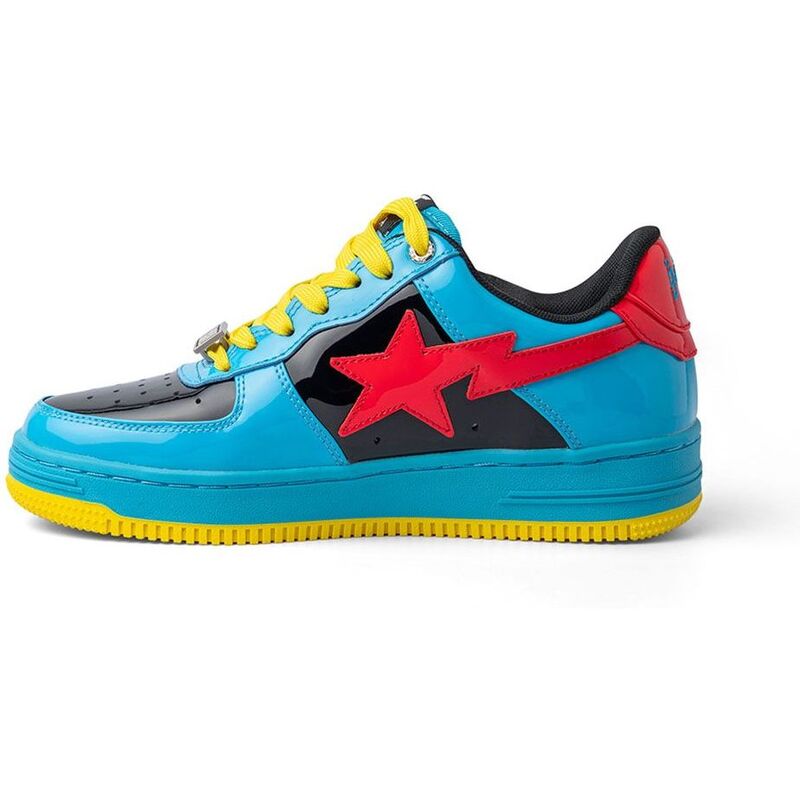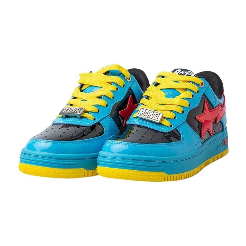 Inspired by the Marvel character Dr. Strange, these sneakers feature an eye-catching design, with blue, black, and red colorways. The upper is made of shiny patent leather in a blue and black red. The striking Dr. Strange graphic and Marvel branding adorn the design, complemented with a red star logo and the embroidered BAPE STA branding.