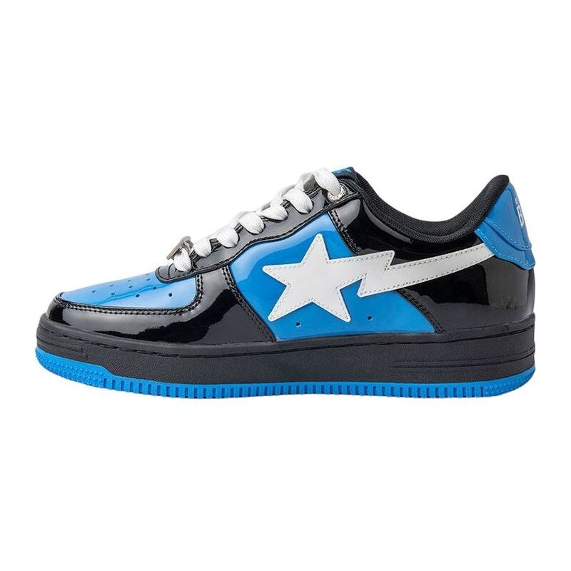 These sneakers feature a Marvel-inspired design in blue and black patent leather, with a white star logo. A cartoon graphic of Venom adorns the design, complemented by the embroidered Marvel branding. The insole features comic book strips of Venom, while the entire sneaker is rounded out by a colored sole unit.