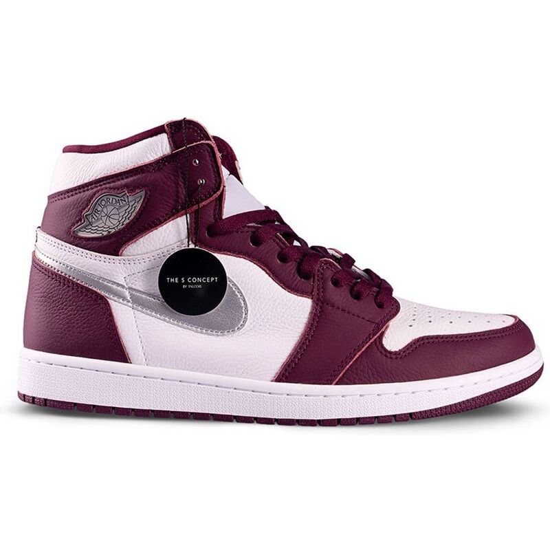 The Air Jordan 1 Retro High OG 'Bordeaux' artfully adorns the classic silhouette with a pristine white leather upper and deep vinous leather overlays at the forefoot, heel, and collar. Echoing the elegance of the CO.JP 'Midnight Navy' colorway, this sneaker is elegantly accented with a metallic silver Swoosh and a jeweled Wings logo on the lateral ankle for a touch of luxury. A woven Nike Air tongue tag rests on the lightly padded nylon tongue, offering a nod to the original design.
