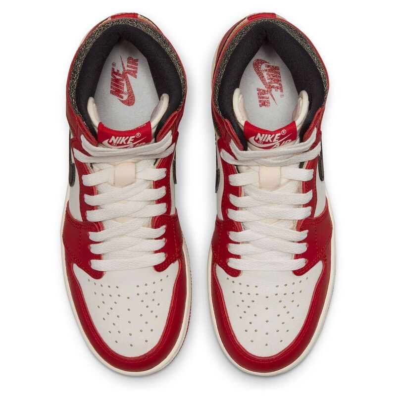 These sneakers reimagine the classic ‘Chicago’ colorway with a vintage look. The upper features white cracked leather, crimson overlays, and a black Swoosh. Nike Air and Jordan Wings logos adorn the design, while the rubber cupsole has a faux oxidized finish, white sidewalls, and a crimson outsole.