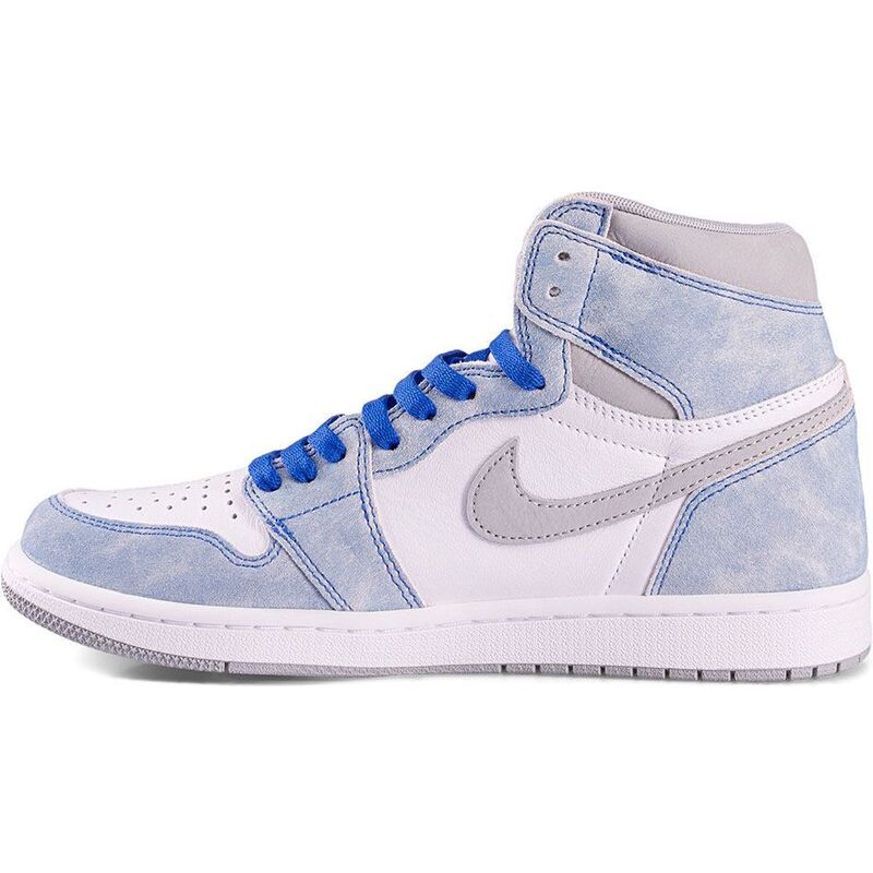 With an elegant weathered look, this high-top features a crisp white leather upper with softly faded blue suede overlays. Subtle neutral grey accents enhance the design, adorned with iconic Wings and Nike logos. Atop the traditional AJ1 rubber cupsole, with encapsulated Nike Air cushioning in the heel, these sneakers ensure timeless comfort and style.